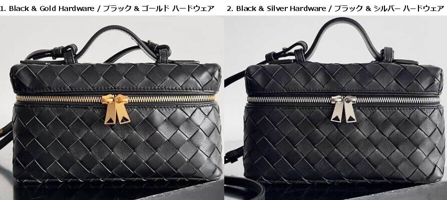以下でご紹介している BV ハンドル・ウィーブ・チェーン・バッグと基本的に同じスタイルですが、こちらはダブル・ジッパーのプルがゴールド金具。(ブラックのみシルバー・金具のオプションがあります。)