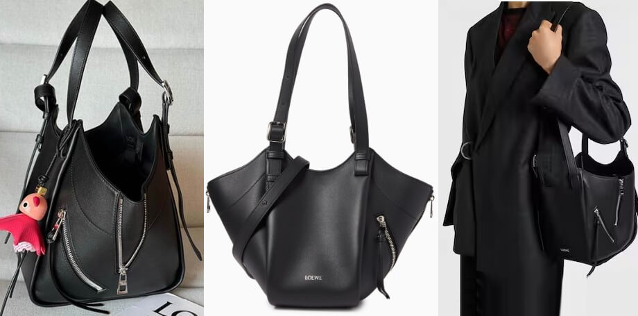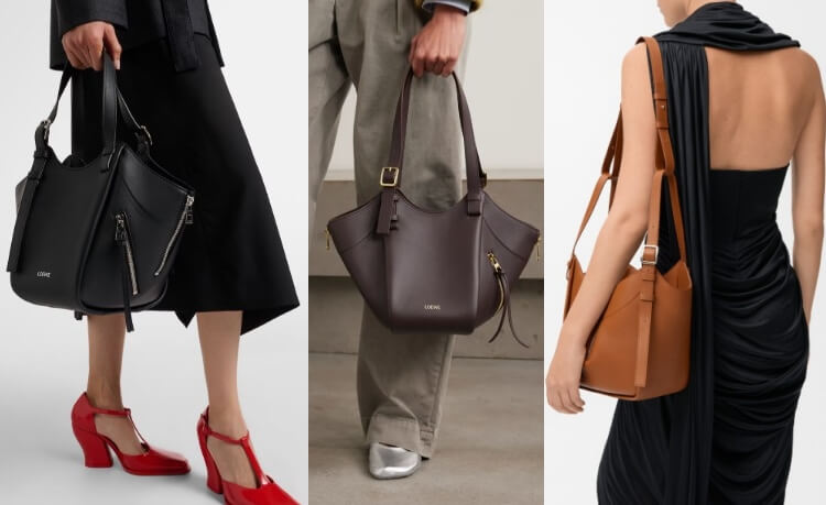 持ち方、閉じ方によって、シェイプを変えるスタイルはオリジナル同様で、ハンドバッグとして持つ際には、サイドジッパーを閉じて逆台形のようなシェイプ。
