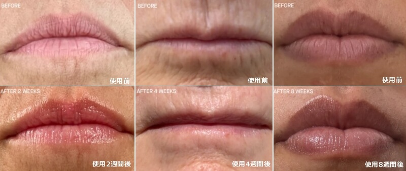上のビジュアルのように、使用から最短2週間で 唇の血色やシワを改善し、失われたボリュームを取り戻し、唇のテクスチャーを整え、