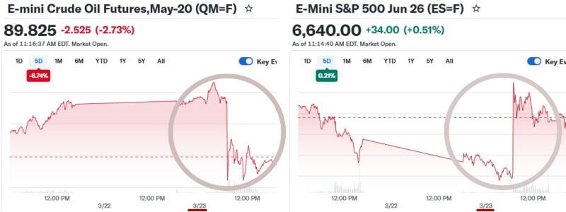 それを受けて、暴騰していた原油の先物価格が大暴落、逆にS&P先物が急上昇したけれど、この投稿の15分前に5億8000万ドル相当の原油先物が売られ、逆に1億5000ドル相当のS&P先物が買われており、