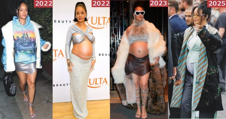 ここではそんなリアーナの2025年のマタニティ・ルックを第一子妊娠の2022年、二子妊娠の2023年との比較でご紹介します。