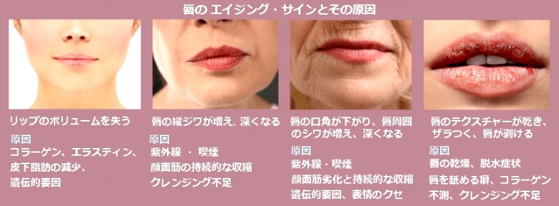 逆に唇に手を抜くと、唇の周りの皮膚や骨、筋肉、毛細血管に至るまでが 劣化の連鎖を起こすので、顔全体の印象が大きく老け込むのは避けられない運命。