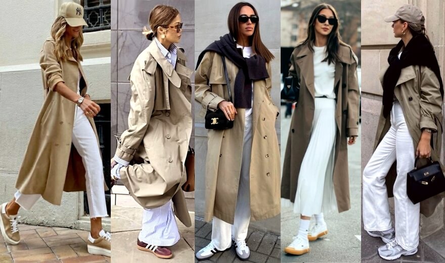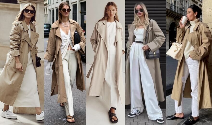 この春、最もトレンディングなトレンチ・コートの着こなしはホワイト・ボトムと合わせるコーディネート。