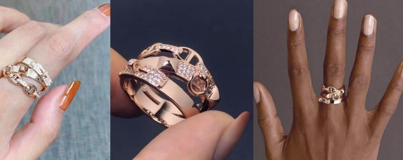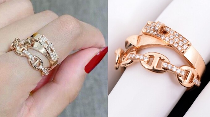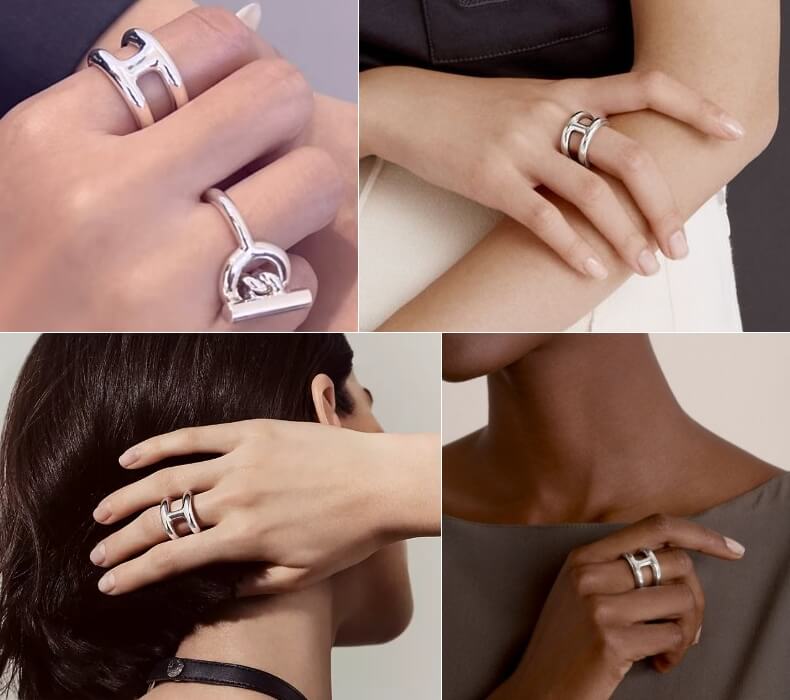 単独でも、他のリングとのレイヤーでも、そしてアンカー・チェーン・リングを2本重ねてもエレガントにつけられます。