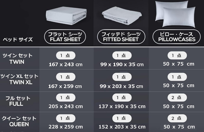 シルバー・インフューズ・ベッドリネン・セット サイズ・チャート
