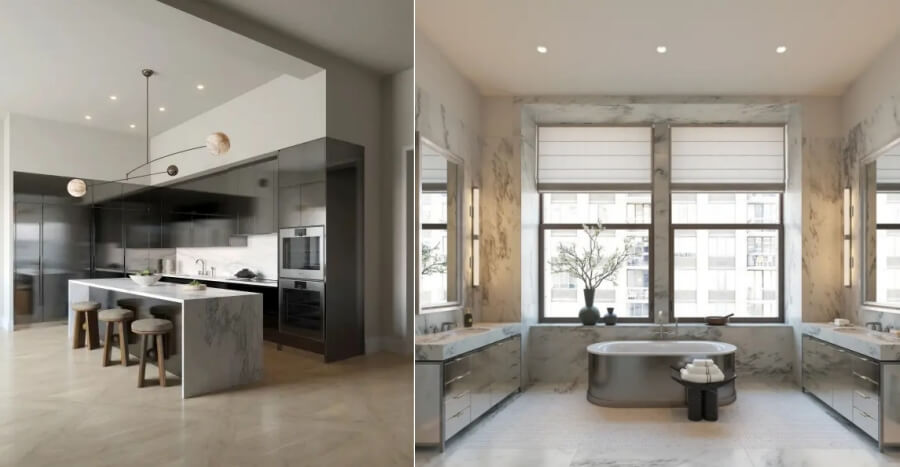 キッチンはガゲナウ製のアプライアンスを備えたモダンで洗練されたデザインで、アイランドは大理石。バスルームは金属製のフラッシュ・パネル・キャビネットと