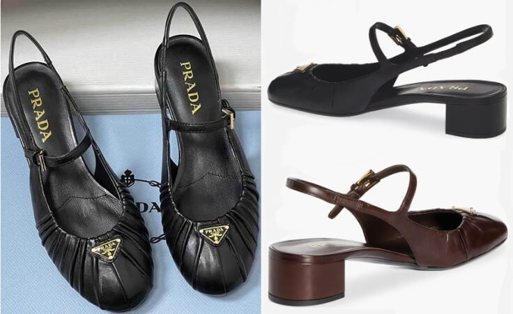 トウに向かったレザー・ギャザーがデザイン・アクセントになったスリングバックは、かかとがオープンで、足の甲にストラップがあるので、通常のスリングバックより安定し、