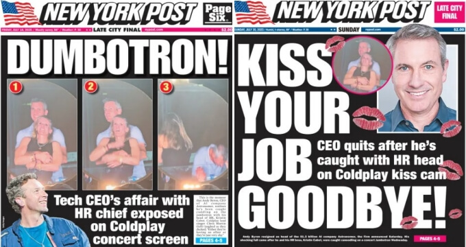 7月3週目にアメリカのみならず、世界中で大報道となったのが、7月14日火曜日にボストンのジレット・スタジアムで行われたコールドプレイのコンサートのキス・カムで発覚したAI企業、