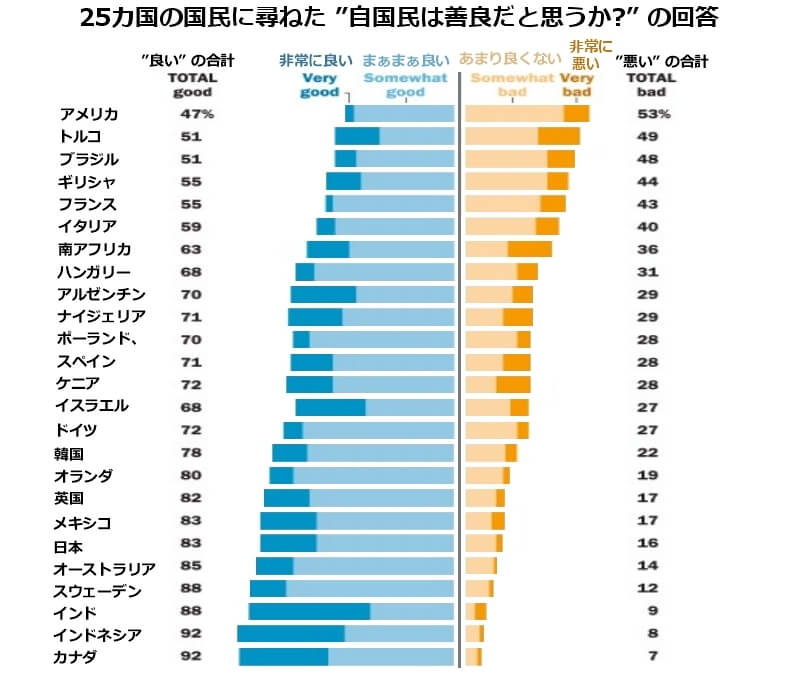 逆に自国民が「善良だ」と答えた人々が最も多かったのはアメリカの隣国、カナダ。