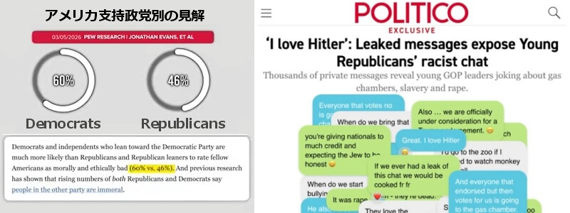 また過去の別の調査との比較でも共和党・民主党の双方の支持者が、「対立政党の支持者は非道徳的である」と考える人の傾向が高まっているとのことで、