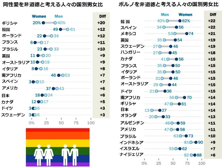 上は同性愛とポルノに関する調査結果で、同性愛を不道徳と見なす人々は、どの国でも男性が圧倒的に多く、女性の方が理解を示しているのが特徴。
