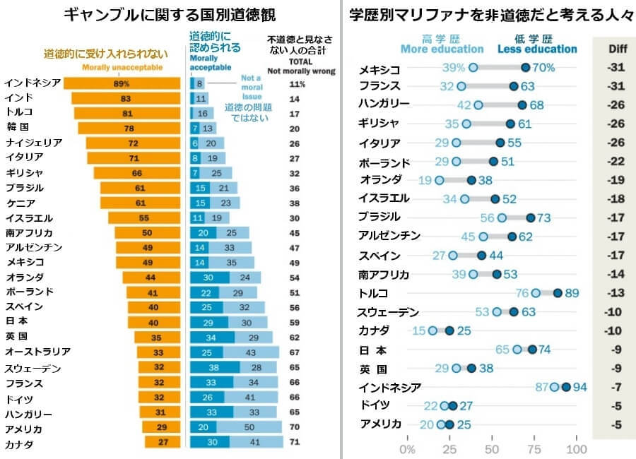 この調査では25カ国の成人を対象に、飲酒、不倫、ギャンブル、同性愛、人工妊娠中絶、ポルノグラフィなど、9項目における道徳観を調査した上で、