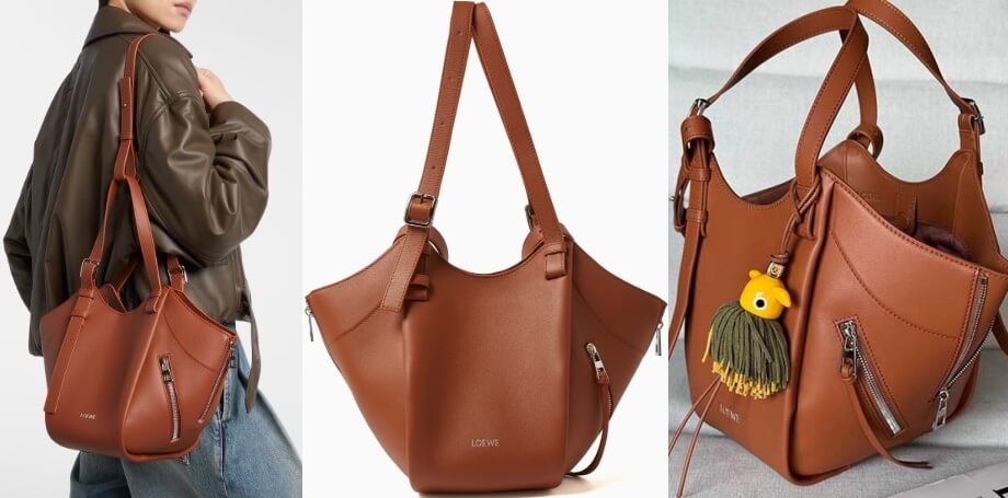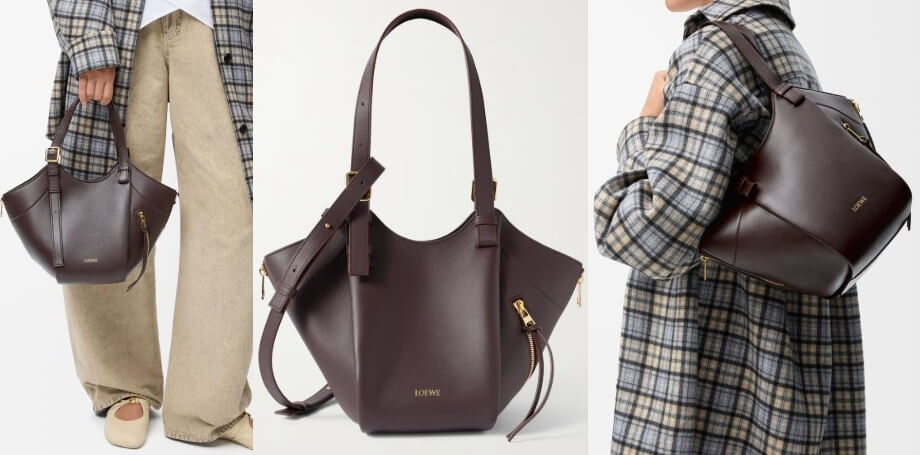 持ち方、閉じ方によって、シェイプを変えるスタイルはオリジナル同様で、ハンドバッグとして持つ際には、サイドジッパーを閉じて逆台形のようなシェイプ。