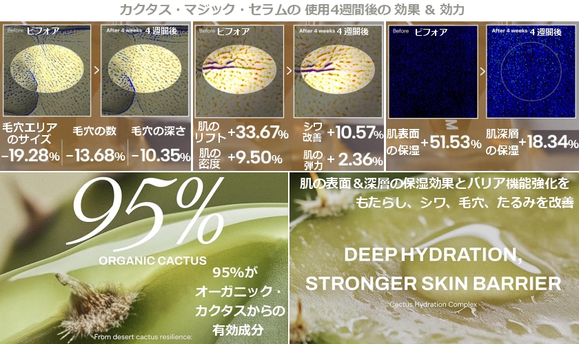 ここにご紹介するカクタス・マジック・セラムは、コールドプレスされたオーガニックのノパル・サボテンのエキスを95.4%配合した、
