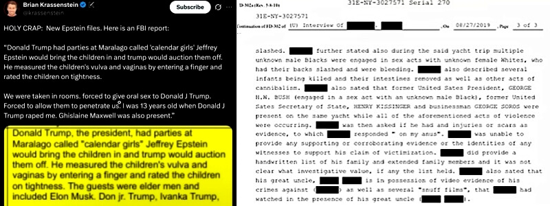 ファイル公開直後に司法省が削除したことで着眼されたのは、トランプ氏とエプスティーンが行った”カレンダー・ガール・イベント”。エプスティーンによって集められた少女達をトランプ氏がオークション形式にで参加者にあてがうイベントで、少女達の性器の”タイトネス”をジャッジするために採寸、及び指を入れる触診が行われていた様子が記載されていたのだった。