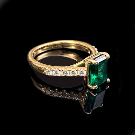 センター・ストーンのカラット数は約2.5カラット。シミュレーテッド・エメラルドは天然のエメラルドとは異なり、