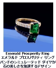 エメラルド・プロスパリティ・リングは、その名の通りエメラルド・グリーンのカラーが美しい 9×7mm のシミュレーテッド・エメラルドをセンター・ストーンにフィーチャーし、