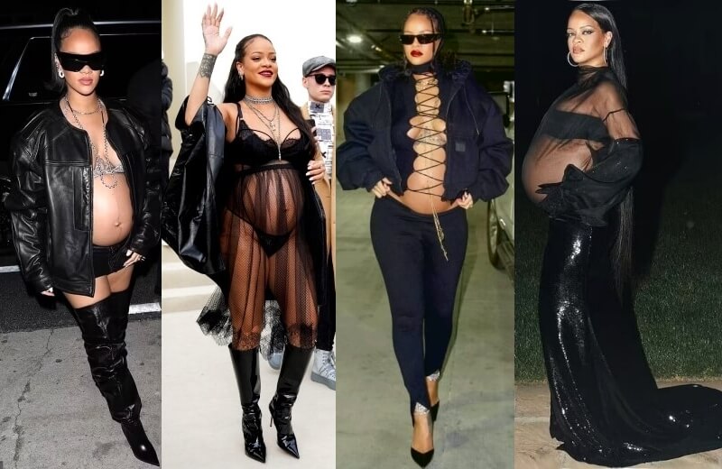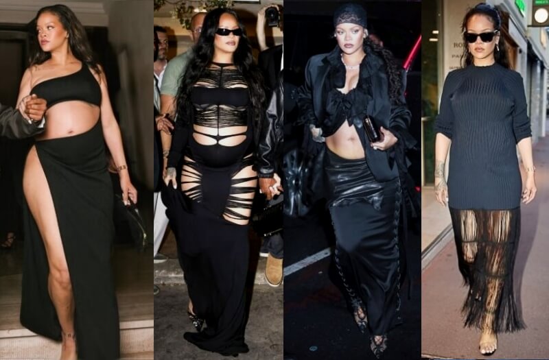 写真上、妊娠中でも、そうでない場合も肌を露出しながらのオール・ブラックのコーディネートがお得意のリアーナ。