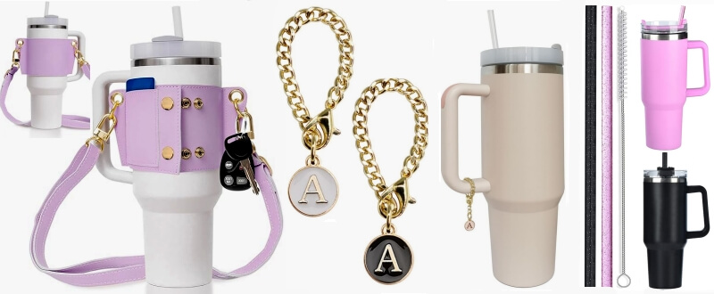 それ以外でスタンレー・カップの人気のアクセサリーは、写真上のようにハンドルにつけるチャーム、カップと同色のストロー、肩から下げるためのストラップ等があるけれど、