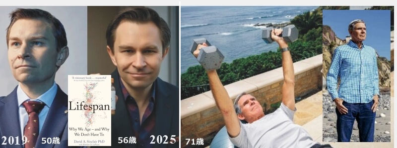前述のシンクレア博士(写真上左側)の方が年齢の割にルックスが若いと言えるけれど、これは恐らくトポル博士の方が自身の健康への取り組みが遅かったため。