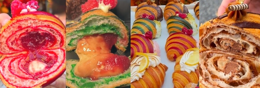 ジョアンズ・ベーカリーのケーキと並ぶ目玉はクロワッサンで、こちらもストロベリー、ラズベリー、ピスタチオなど、フレーバーが生地に織り込まれ