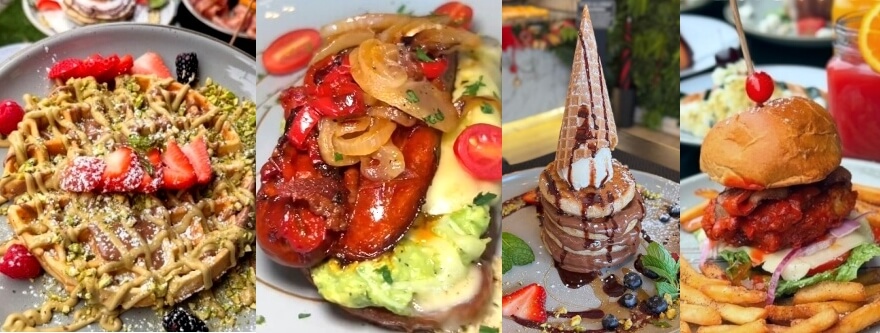 名物はバーガー、アイスクリーム・コーンを逆さまにトッピングして、クリームを間に挟んだパンケーキのレイヤー。