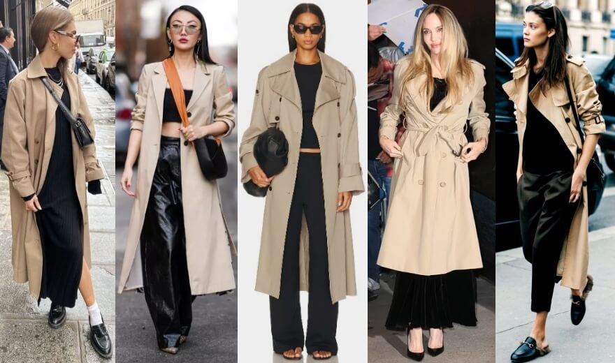 トレンチ・コートで絶対失敗が無いコーディネートは、写真下段のように