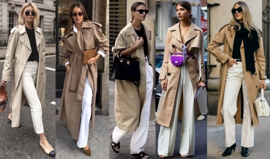 この春、最もトレンディングなトレンチ・コートの着こなしはホワイト・ボトムと合わせるコーディネート。