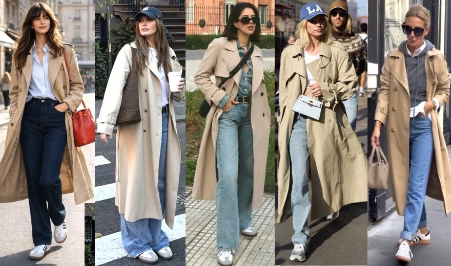 トレンチ・コートのドレスダウン・スタイルの定番は、やはりジーンズ&スニーカーとのコーディネート。
