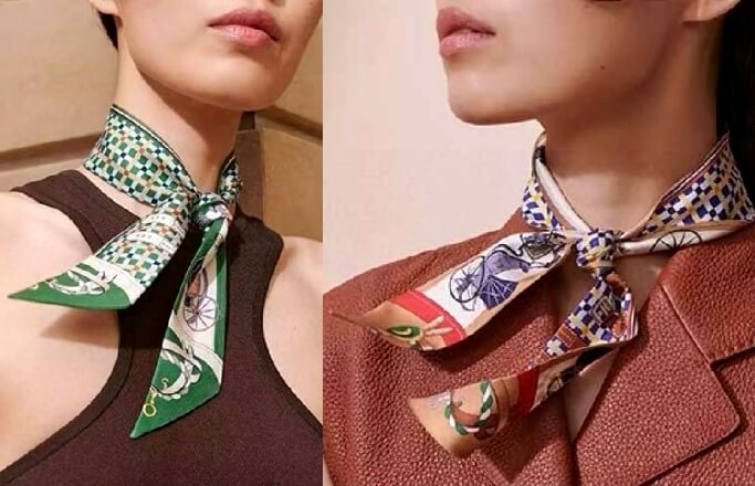 服と同色系でコーディネートしても、コントラスト・カラーにしても、またベルトやバッグ、シューズとのマッチング・カラーを選んでもスタイリッシュです。