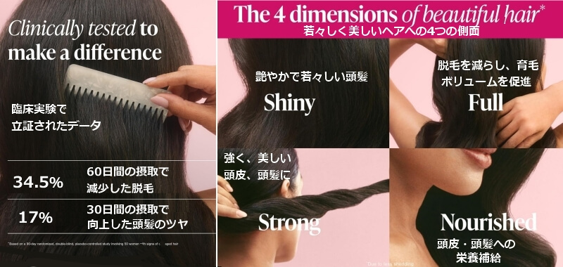 女性に特化して、育毛、発毛、毛根と頭髪の強化、健康的な地肌の実現による育毛サイクル促進のためにデザインされたのがこのサプリメントです。