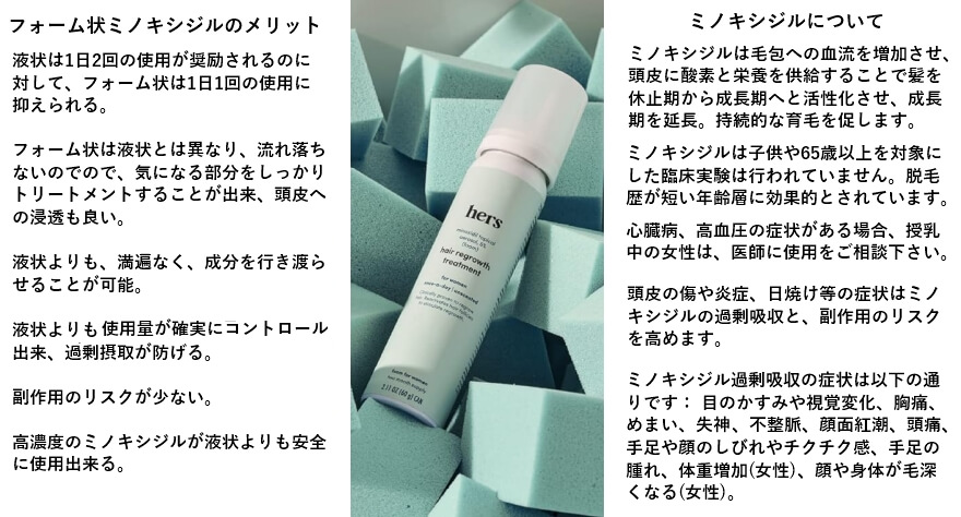 ちなみに、ハーズではフォームでは5%のミノキシジルを使用していますが、液状のミノキシジル製品では、男性用は5%でも女性用は安全性を考慮して2%の強さになっています。