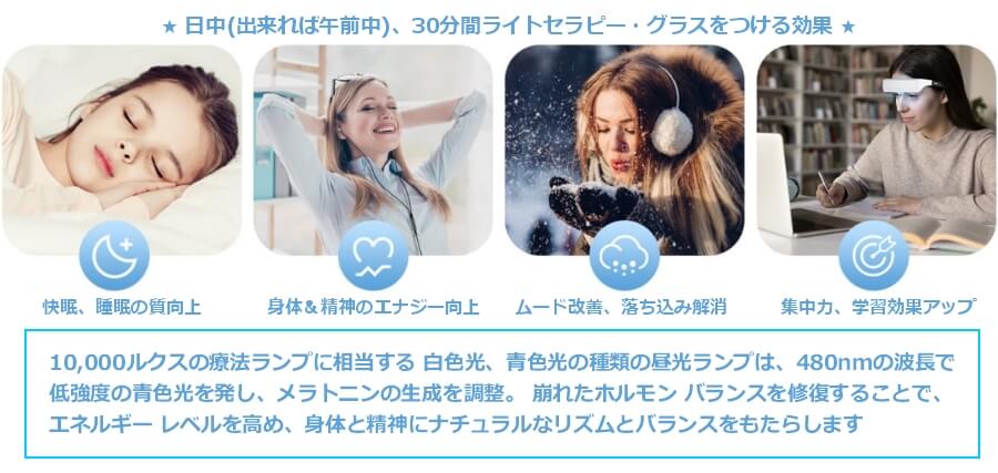 眼鏡スタイルのディバイスで視覚的に認識させることで、体内のメラトニン・レベルを調整し、精神の安定、