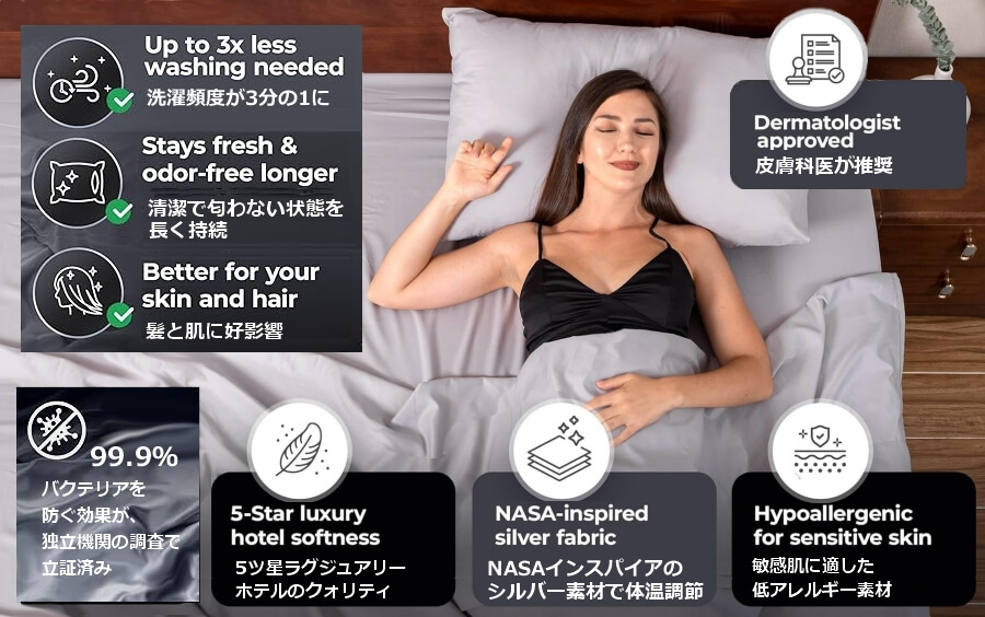 より清潔で健康的な睡眠環境を提供しながら、快眠中の肌や髪をダメージから防ぎ、結果的に美肌、美髪、アンチエイジング効果をもたらしてくれます。