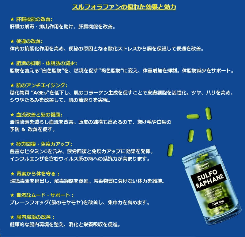 ここに御紹介するサプリは1回の摂取量に700rの有効成分が含まれ、浸透力は98%。有効成分の中には、体内でグルコラファニンをスルフォラファンに変換する酵素、ミロシナーゼも含まれています。