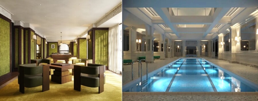 アメニティは、屋内プール、ビリヤード・テーブルを擁したゲーム・ラウンジに加えて、ピアノのある落ち着いたサロンやジムなどで、
