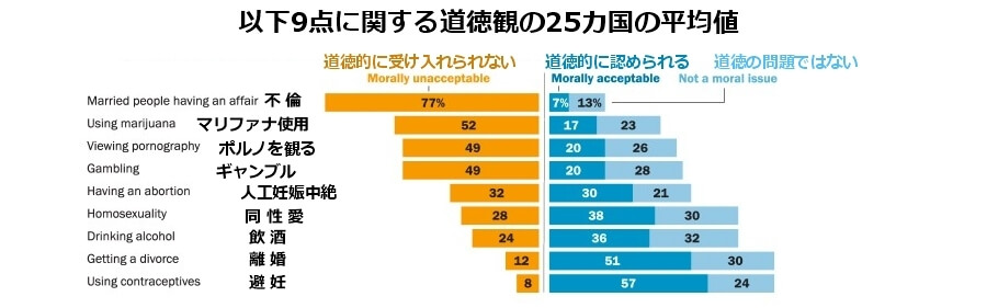 この調査では25カ国の成人を対象に、飲酒、不倫、ギャンブル、同性愛、人工妊娠中絶、ポルノグラフィなど、9項目における道徳観を調査した上で、